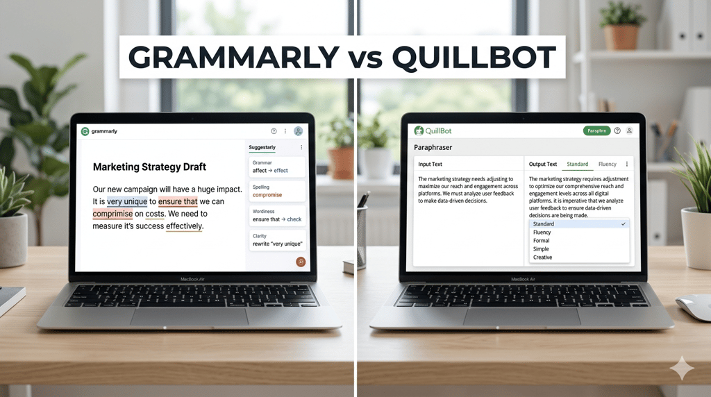 Compare Grammarly vs QuillBot in 2026 and discover which tool is better for grammar, rewriting, paraphrasing, and writing improvement.